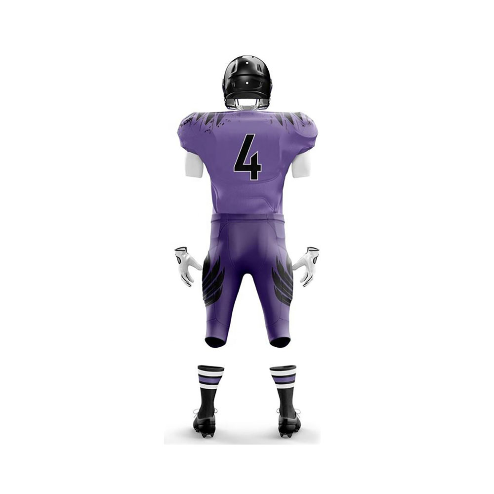 American football uniforms are specialized attire designed for players to provide both protection and performance during the game. These uniforms typically include a padded jersey, pants with built-in padding for the hips, thighs, and knees, as well as a helmet and shoulder pads for safety. Made from durable, breathable materials, they allow players to move freely while minimizing the risk of injury. The uniform also includes accessories like gloves, socks, and cleats, and often features team colours and logos. The design prioritizes both functionality and team identity on the field.